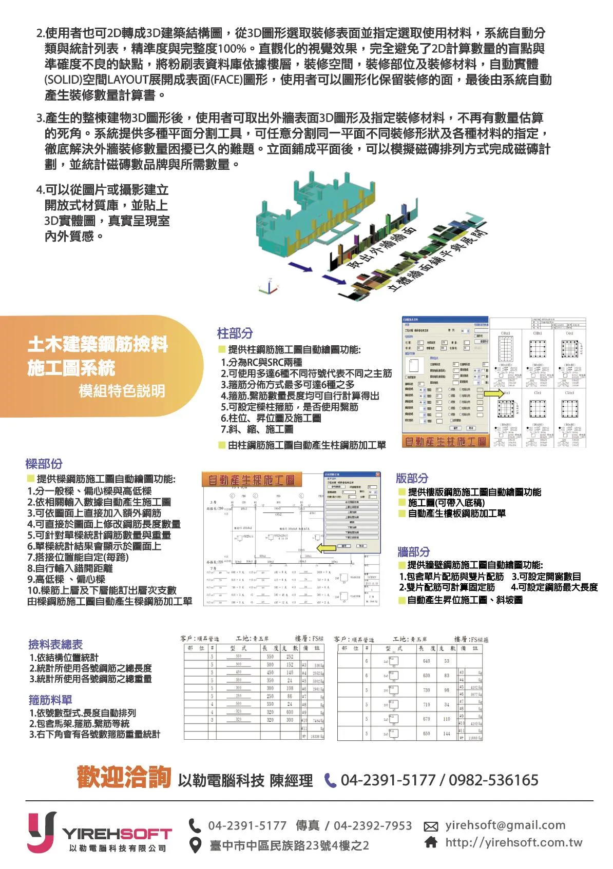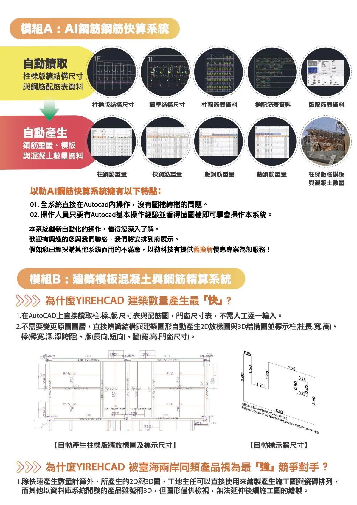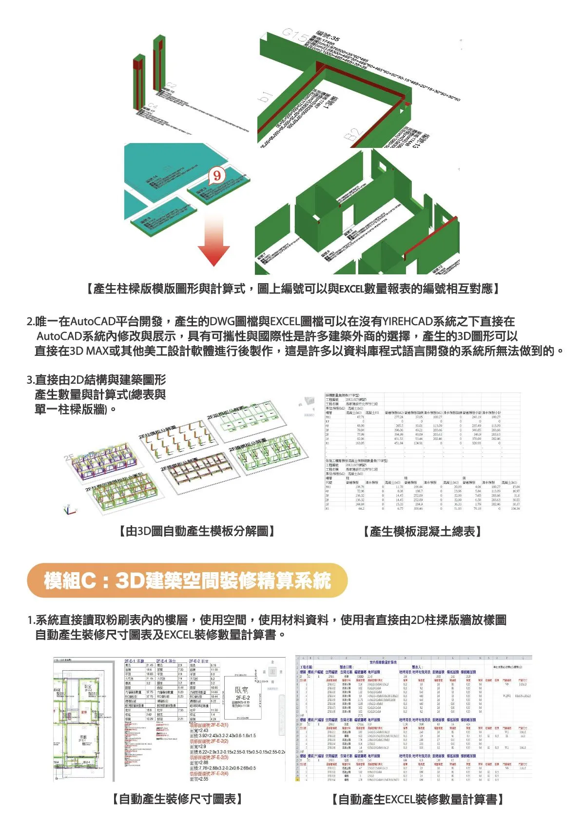 以勒科技推出 YIREHCAD 3D建築營造數量精算系統,國內唯一真正基於 3D Solid 模型的精算系統。不同於僅能顯示影像的 3D 模型,YIREHCAD 可進行聯集、差集、剖切與標註,並自動生成可直接於 AutoCAD 開啟的 DWG 圖檔,亦可與 SketchUp、3D Max 無縫串接,快速產生模板、混凝土及裝修數量。