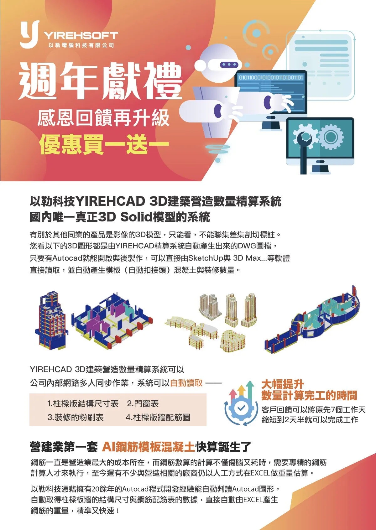 以勒科技推出 YIREHCAD 3D建築營造數量精算系統,國內唯一真正基於 3D Solid 模型的精算系統。不同於僅能顯示影像的 3D 模型,YIREHCAD 可進行聯集、差集、剖切與標註,並自動生